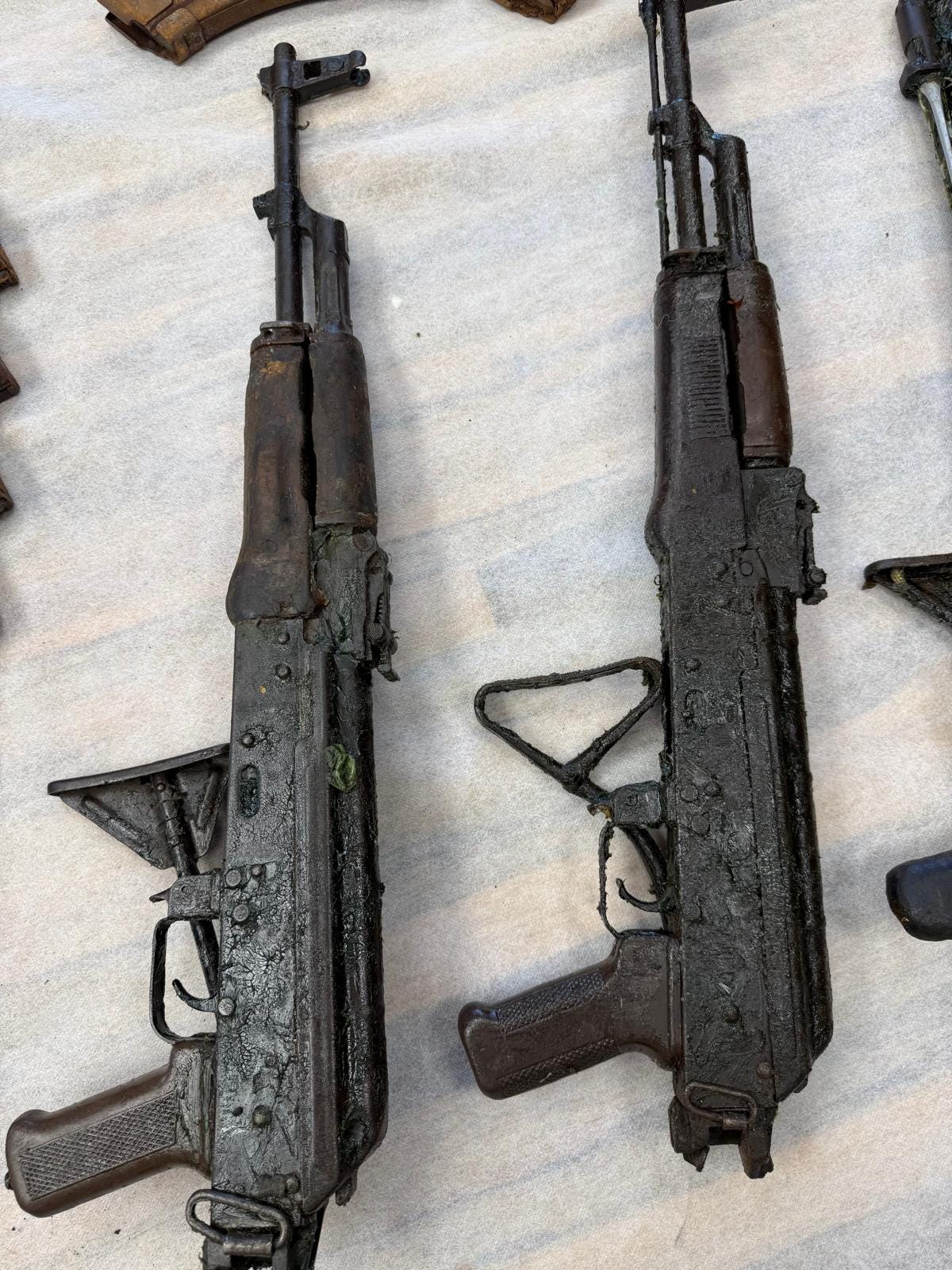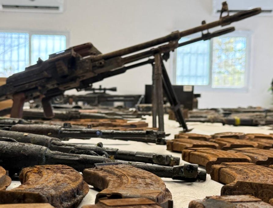 Below are two photographs. The first shows an image of the five Hamas terrorists running from their tunnel hideaway in the Israeli-controlled zone. They were shot before they escaped. The second photo shows a range of the weapons cache the IDF found when they searched the tunnel. Among the haul were numerous Kalashnikovs, the Russian-made weapon favored by Hamas. They were grimy. But as the senior IDF official briefing me stated: “Kalach is the best in class. These all still work.” (Everyone in Israel uses the short form - Kalach.)