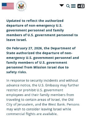 Shortly after the above message showed up in one of my chat groups, an email that U.S. Ambassador Huckabee had sent to all American Embassy staff began circulating online. It raised the urgency of leaving Israel a notch or two. Click on the X post below to read the entire summary of Huckabee’s email: