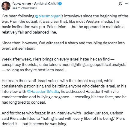 X (Twitter):I am posting here the full links to the most recent Uncensored episode in which Jonathan Conricus appeared, as well as the episode featuring Minister Amichai Chikli. Both ran last week. If you go to Piers Morgan’s personal X account you will find numerous clips that he considered post-worthy from these episodes. You watch. You decide.