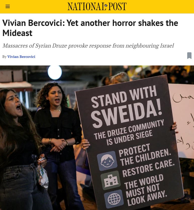 For starters, my column on the Druze crisis in Syria – in which Israel became directly and deeply embroiled – ran on Saturday in the National Post. As has been the case with my columns lately, this one is paywalled, so I cannot set it out here… or I’ll quite rightly incur the wrath of my editor. But you may want to go for a trial subscription to what is unquestionably the best daily (almost) newspaper in paper in Canada these days.