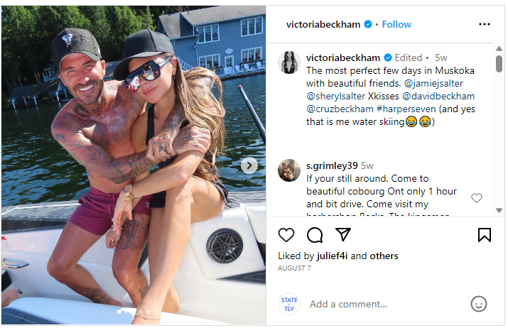 A month ago, for the sacred August long weekend in Ontario, Victoria and David Beckham – aka Posh and Becks – told the world about their sublime visit to these parts at the summer home of close billionaire friends. Vic posted shots of her waterskiing (terrible form – her back must have been aching something fierce the following day) and snuggles on the boat and dock with Becks. If her Insta persona and reveals are to be believed, she had a real lightbulb moment while here, finally stumbling upon what’s important in life. Her thoughts, paraphrased.