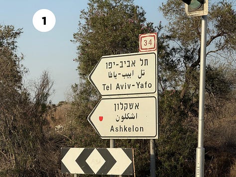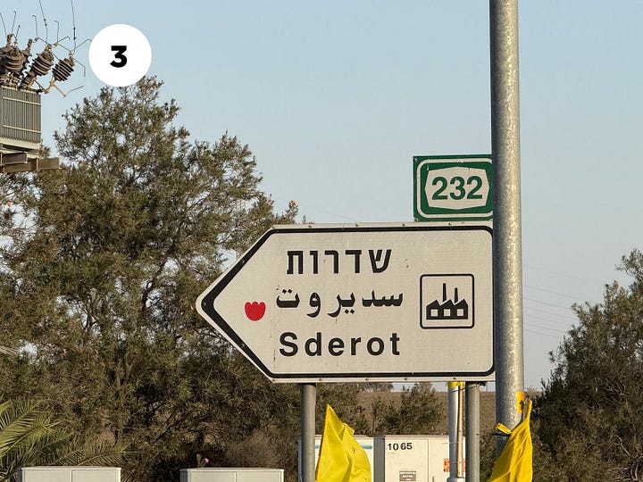 1 and 2) These road signs are situated at different points at the Sha’ar HaNegev intersection, where two major regional roads meet - 232 and 34. From very early on the morning of October 7, Hamas controlled this junction, murdering anyone who happened to drive through. People trying to flee the barrage of rockets pounding nearby Sderot were trapped by Kalashnikov and RPG fire, everywhere. They didn’t stand a chance.