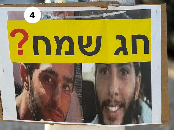 “Happy Holidays?” At this time of year, there are successive holidays marking the Jewish new year. Other than on Yom Kippur - the Day of Atonement - we typically greet one another by saying - Happy Holiday. But that phrase does not roll off the tongue this year, nor has it at any time since October 7. This poster shows Nimrod Cohen, an IDF soldier captured in uniform, and Matan Zangauker, now 25, who was brutally kidnapped from his home on Kibbutz Nir Oz.