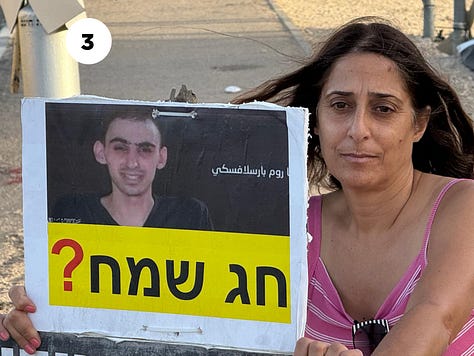3. The woman pictured holding the sign sat alone on the opposite side of the main Kabbalat Shabbat gathering. She holds a poster of Rom Braslavski, 21. The image is a screen grab from a psychological torture video of Rom released by his Palestinian Islamic Jihad captors in late July. As his parents remarked at the time, Rom is a broken man. He was unable to even stand when filmed by his PIJ captors. Like Evyatar David, he appeared to be at death’s door but it is believed that he is alive.
