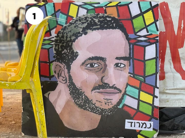 Two Kfar Aza residents remain in captivity and are believed to be alive - 28 year old twins, Gali and Ziv Berman. Their faces look out at us everywhere. Even the yellow flags and posters with their photographs are tired, faded, falling over.