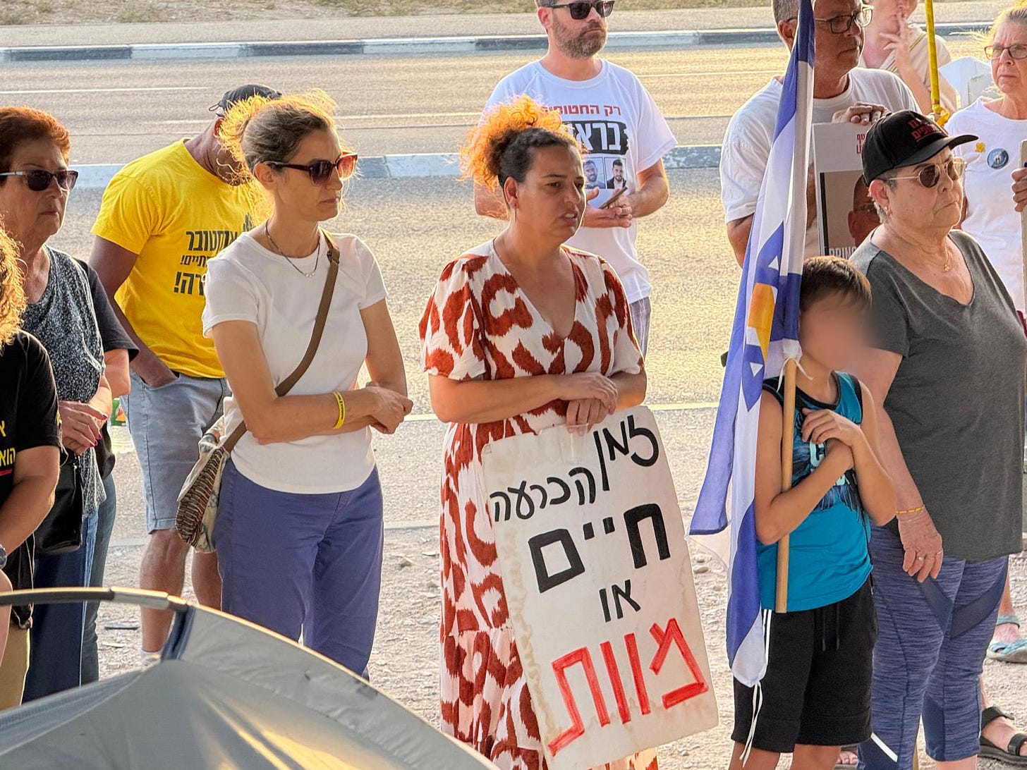 A sign on a vehicle parked along the side of the highway near the Kabbalat Shabbat spot. It reads: “Why is my daddy still in Gaza?” The question was asked by four-year-old Roni Miran-Lavi of her mother, Lishay Miran-Lavi. When she was just two, Roni watched as Hamas terrorists bound her father and kidnapped him and a neighbor, Tsachi Idan. The two families had been held together for hours by masked terrorists in the Idan family home on Kibbutz Nahal Oz. Hamas live-streamed their torment and cruelty.
